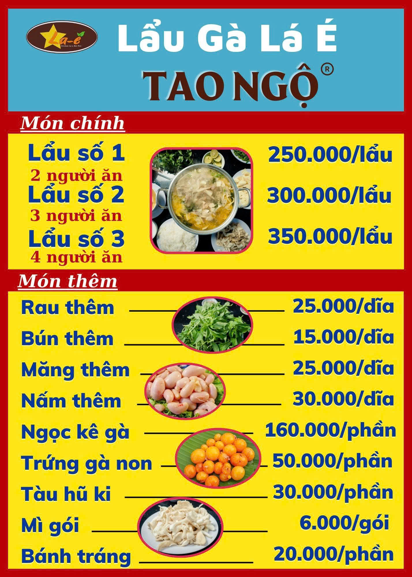 Chúng tôi có nhiều kích cỡ nồi lẩu phù hợp cho 2-4 người hoặc nhóm đông hơn. Ngoài ra, bạn có thể gọi thêm rau, nấm, bún, mì hoặc các món phụ khác tùy theo sở thích.